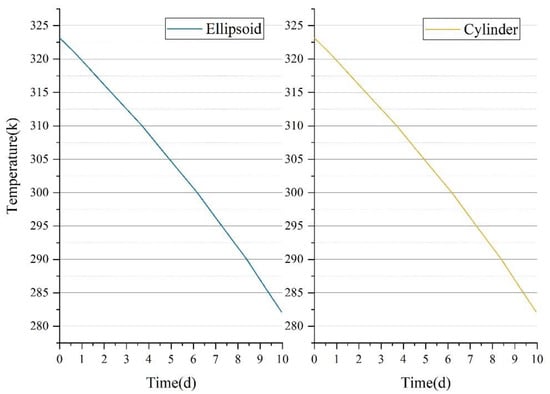 In order to explore the influence of container shape on the temperature change associated with the Joule–Thomson effect, two container shapes, ellipsoid and cylindrical, were designed for comparison. Both models were two-dimensional axisymmetric models, as shown in Figure 9. With the same boundary conditions, the outlet pressure was dropped from 10 MPa to 5 MPa at the same time, and the gas in the region was averaged. The simulated temperature results are shown in the Figure 10; it can be seen that the temperature trend and amplitude were the same.