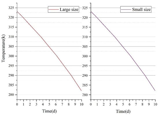 In order to explore the influence of volume on the temperature change associated with the Joule–Thomson effect, ellipsoidal models of two sizes were designed, as shown in Figure 11. Similarly, the two models with different sizes adopted the same boundary conditions, the outlet pressure was dropped from 10 MPa to 5 MPa at the same time, and the gas in the region was averaged. The simulated temperature results are shown in Figure 12; the same trend and amplitude of temperature change were observed.