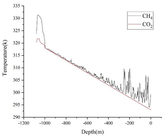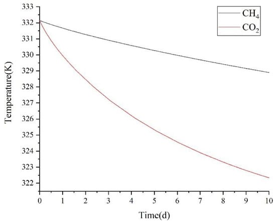 With the same numerical modeling and operation conditions, we conducted a 10-day gas withdrawal simulation case study of CH4 and CO2. In Figure 13, it can be seen that the temperature of CH4 fluctuated at the wellbore section and the bottom of the cavity. The variation trends of CH4 and CO2 were similar, although the temperature of CO2 was lower than CH4. The inlet pressure variation in response to the constant withdrawal of CH4 for 10 days is listed in Table 3. A comparison of the average temperatures of CH4 and CO2 is shown in Figure 14. Both temperatures decreased with decreasing pressure during the withdrawal process; the temperature of CO2 decreased more rapidly and was reduced to approximately 10 K, while that of CH4 was reduced to 3 K. The response of temperature to withdrawal was much more severe for CO2 due to the difference in thermal properties between CH4 and CO2. The response of the surrounding wall was not only associated with the thermal properties of the cycling loading fluid, but also the characteristics of creep of the rock salt.