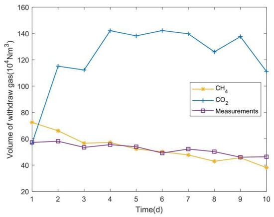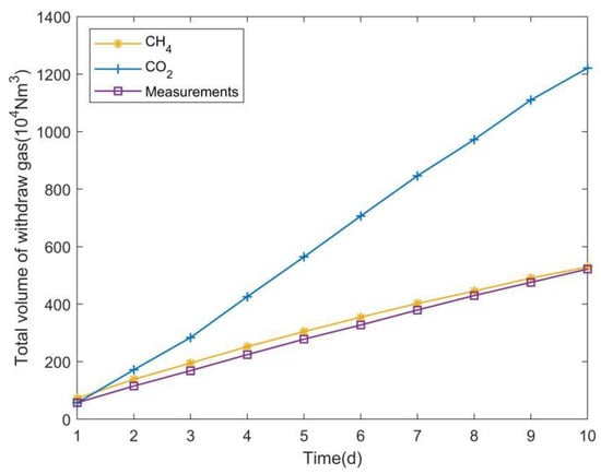 The proposed integrated wellbore–cavity thermomechanical coupling model was verified using the gas capacity data provided by the operators of the Jintan gas storage facility. In Figure 15, the simulation results of the numerical modelling for CH4 are compared with measurements from field testing. At the initial stage, the simulation result was higher than the measurement value; from day 3, the simulation value was consistent with measurements obtained during testing. Figure 16 illustrates the total volume of gas withdrawal. During the 10-day gas withdrawal period, the simulated calculation value was 5.288 million m and the measurement value was 5.2208 million m3; the error was 1.3%. The cause for error was identified as the swift operation between gas injection and withdrawal, causing a hysteresis effect on the temperature variation in the cavity. When the gas injection and withdrawal material was replaced by carbon dioxide, operating at the same rate of pressure drop, the volume of CO2 was much higher than that of CH4. The total volume of CO2 was 12.209 million m3, approximately 2.3 times the volume of CH4. In the context of the same operation conditions, a greater volume of CO2 can be stored in underground salt cavities.