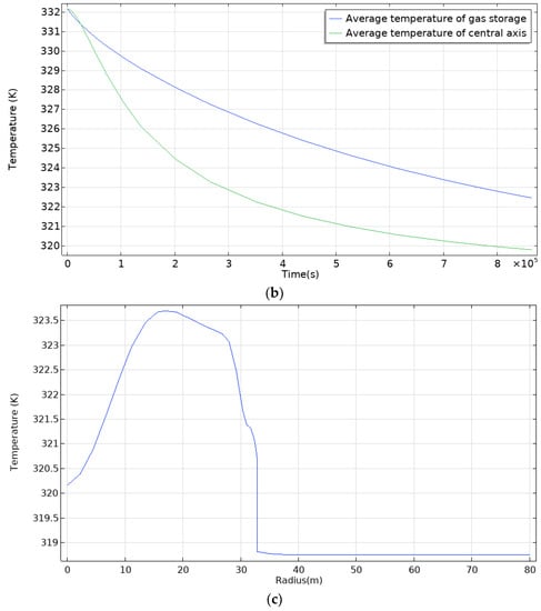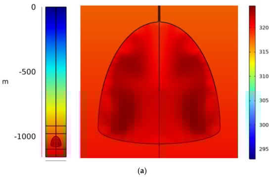 To investigate the response of the surrounding wall of the salt cavern to gas injection and withdrawal, a series of evaluation simulation cases were implemented based on the integrated wellbore–cavity thermomechanical model. Figure 17 illustrates the temporospatial variation in temperature in the context of the 10-day withdrawal operation. Figure 17a shows a 3D view of the temperature distribution around the ellipsoid shape of the salt cavity—the temperature was uniform on cavern wall. During the 10-day CO2 withdrawal, the temperature decreased rapidly, and the decreasing amplitude reached its largest at the centerline. The depth of the salt cavity was 1012 to 1086 m, and the maximum radius was 40.15 m. Figure 17c shows the temperature inside the cavity; there was a spatial fluctuation in the temperature around the cavity, but it was only several K in scale. When the CO2 withdrawal was finished, it was obvious that there was a drastic decrease of approximately 12 K.