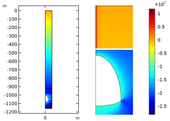 The rock surrounding the gas storage is subjected to two loads:—one is the gravity of the upper rock and the other is the gas pressure received at the cavity wall—and the thermal stress caused by the temperature change at the cavity wall must be considered. The differential equation of rock deformation is shown in Equation (1g):