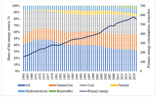 For the past 55 years the fuel and energy balance did not have drastic changes based on the data of the global energy consumption by the type of energy source (Figure 1). Fossil fuels dominated the balance and their share stayed within the 83–86% range for the past decades. For example, in 2020 oil was accountable for 31.3% of the energy mix, whereas natural gas and coal were 24.7 and 27.2, respectively. Nuclear energy had a large increase in usage from 1980 to the 1990s; however, due to the controversy over the safety regulations and possible repercussions after emergency situations, the share was only 4.3% in 2020. Hydroelectricity is considered as another alternative to fossil energy; however, it also holds some limitations and the share of this source was 6.9% in 2020. RES, of which development and consumption is one of the key points of the current energy transition, was accountable for only 5.7%. It is worth mentioning that for different macroregions and specific countries, these shares and their dynamics over the years deviate to a great extent.