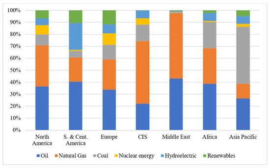 Energy and fuel mix by macroregions in 2020. Source: compiled by author based on the BP’s Statistical Review of World Energy.