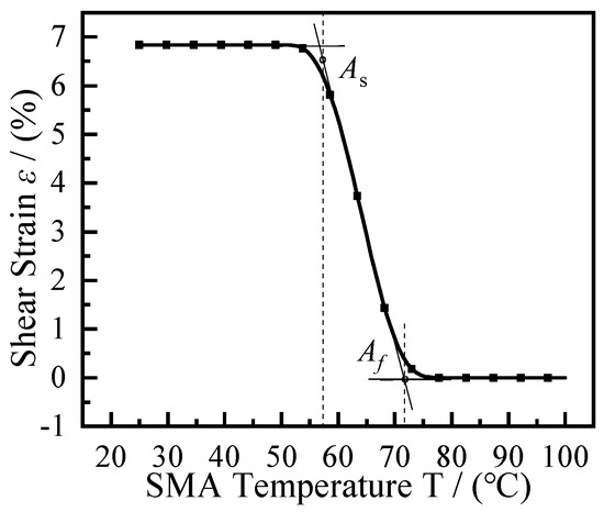 The relationship between SMA shear strain and temperature during the heating-induced shape memory effect phase is shown in Figure 2. SMA temperature from 20 °C to 100 °C in the process of increasing the SMA shear strain gradually reduced to 0%. In the SMA shear strain and temperature curve there are two inflection points, and the tangential extension of the curve is formed by the virtual intersection of and , The martensite to austenite transformation starts at a temperature of 57.85 °C. The martensite to austenite transformation finishes at a temperature of 72.85 °C.