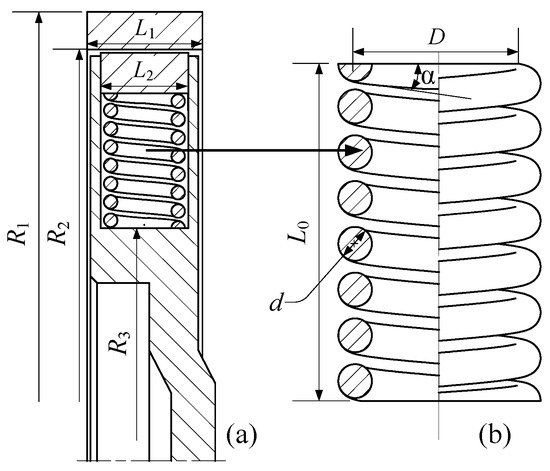 The simplified model for FEM is established as shown in Figure 3. In Figure 3b, the wire diameter of the SMA spring = 1.95 mm, the helical angle of the spring coil = 6°, spring diameter = 12.5 mm (), free height = 20 mm, and effective number of helical turns = 6. A simplified SMA fan clutch model is shown in Figure 3a, where = 110 mm, = 100 mm, = 70 mm, = 28 mm, and = 20 mm. Meanwhile, except for the friction ring, which is a semi-metallic friction material, all the other parts are set to Q235, and the friction coefficient between the contact parts is = 0.35. When the load is set by FEM, the rotor is set as displacement constraint, the friction ring is set as fixed constraint, the initial temperature of SMA spring is set as 25 °C, and is set as 100 °C when heating.
