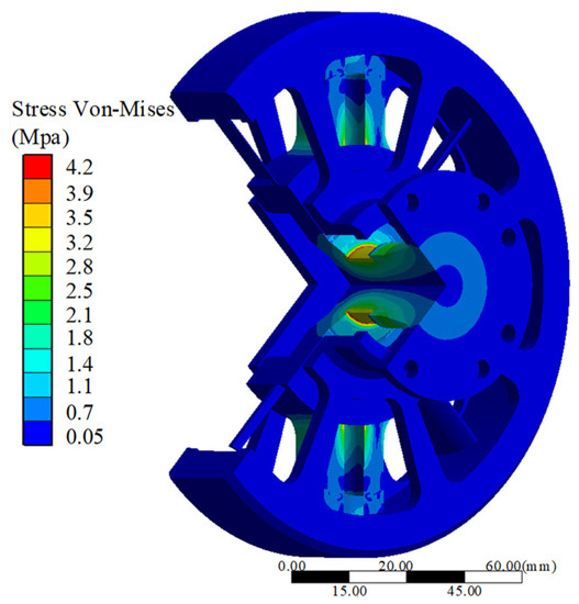 The stress distribution cloud of the SMA fan clutch analyzed by FEM is shown in Figure 4. To observe the stress distribution of the SMA fan clutch, the stress distribution of the SMA spring is not shown in Figure 4, because the stress produced by the shape memory effect of SMA spring heating is much greater than the contact stress in the device. The stress distribution during the SMA spring shape memory effect is shown in Figure 5.