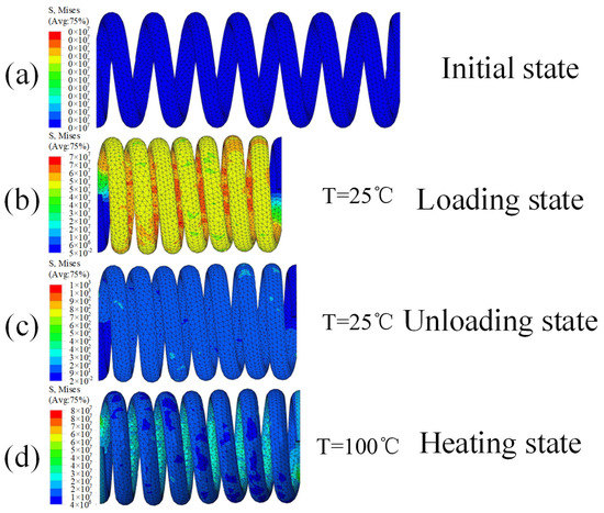 SMA stress distribution plots for each state. (a) Initial state of spring; (b) Loading state of spring; (c) Unloading state of spring; (d) Heating state of spring.