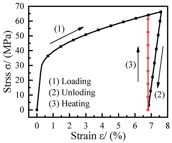 The stress–strain curves during the generation of shape memory effect in the SMA, as simulated by the FEM, are shown in Figure 6. The nonlinear stress caused by the external force load ( = 80 N) during the loading phase increased to 66.5 MPa, at which time the nonlinear strain generated by the SMA was 7.6%. After completing the loading, the SMA transforms from austenite to non-twin martensite, the external load is withdrawn, and the SMA enters the unloading stage, where the nonlinear strain can be recovered during the stress reduction to 0 MPa to transform into residual strain, which is 6.8% at this time (). Finally, by heating the SMA temperature to 100 °C, the SMA transforms from non-twin martensite to austenite, and the residual strain is not recovered because the axial displacement receives restraint, and the stress increases to 62.5 MPa.