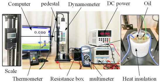 The main devices involved in this setup include a digital display push–pull meter, digital display thermometer, manual base, digital display scale, and digital DC power supply. The gap between the SMA spring and beaker inner wall is filled with hydraulic oil (specific heat capacity: 1.7 KJ/(kg·°C), heat transfer rate: 0.2 W/(m·°C)). The hydraulic oil has good heat transfer, and while the thermocouple is in contact with the SMA surface, the hydraulic oil in the gap between the thermocouple and SMA conducts the heat from SMA to the thermocouple by heat transfer, which can improve the accuracy and stability of the SMA temperature measurement.