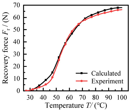 The relationship between the SMA spring reversion force and temperature is shown in Figure 8. The temperature curves of the experimentally derived restoring force are consistent with the theoretically calculated restoring force temperature curves. When the SMA spring temperature is lower than 45 °C, the growth of the recovery force is slower. When the temperature of the SMA spring is between 45 °C and 80 °C, the growth of is more rapid. When the SMA spring temperature exceeds 95 °C, the growth of the tends to stagnate, and the reaches a maximum when the SMA spring temperature reaches 100 °C. The experimental maximum is 66.3 N, and the maximum based on the FEM is 68.1 N, with an error of 2.71%.