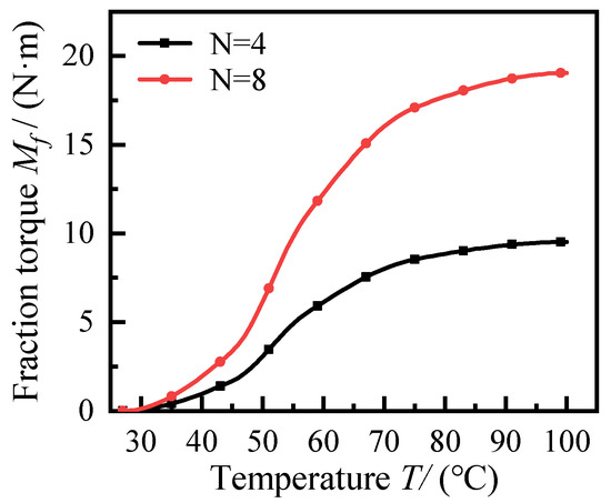 The relationship between SMA spring temperature and friction torque can be obtained by combining the friction torque calculation formula shown in Equation (11) and the SMA spring return force versus temperature shown in Figure 8, as shown in Figure 9. The maximum torque that can be transmitted by the clutch is 9.52 N·m ( = 100 °C) when the number of SMA springs inside the clutch is four (N = 4), and 19.04 N·m ( = 100 °C) when the number of SMA springs is eight (N = 8). Considering the wide circumferential SMA spring-mounting position of the adaptive SMA fan clutch, as shown in Figure 1, two SMA spring arrangement schemes were designed, one with four SMA springs evenly distributed around the rotor and the other with eight SMA springs around the rotor. With different SMA spring arrangements, different transmission characteristics can be met with the same overall structure.