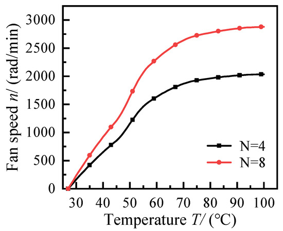 From Figure 11, it can be seen that when the SMA fan clutch temperature is lower than 70 °C, the temperature and fan speed are close to linear growth, and when the SMA fan clutch temperature is higher than 75 °C, the fan speed grows more slowly as the temperature rises. When the number of SMA springs is four (N = 4), the maximum speed of the fan clutch is 2034.8 , and when the number of SMA springs is eight (N = 8), the maximum speed of the fan clutch is 2877.2 .