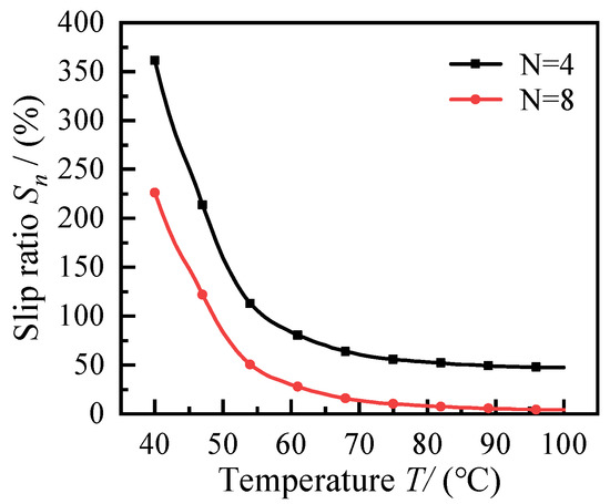 The synchronization characteristics of the active and driven parts of the SMA fan clutch at different temperatures are quantified by the slip ratio , which is = ( − )/, where is the speed of the active part of the clutch and is the speed of the driven part. Combined with the fan speed at different temperatures of the clutch, shown in Figure 11, to obtain the slip ratio of SMA fan clutch at different temperatures, there is a high slip ratio shown in Figure 12, when the SMA fan clutch temperature is lower than 55 °C, but the slip ratio decreases more rapidly in the process of temperature increase. When the SMA fan clutch temperature is higher than 75 °C, the slip ratio tends to stabilize. Four SMA fan clutches are set in the SMA fan clutch in this case; the active and driven parts are not synchronized, and the relative friction is more violent during the working process, so the SMA fan clutch with four SMA springs is not suitable for driving the F450 fan. When the SMA fan clutch has eight SMA springs and the clutch temperature reaches 100 °C, the rotation rate is stabilized at 4.3%, and the active and driven parts are synchronized; at this time the SMA fan clutch can meet the required transmission performance of the fan.