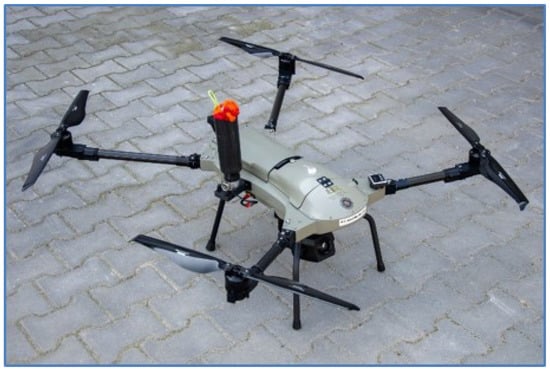In the conducted experiments with the use of MATLAB/Simulink environment, a dynamical model of a military AtraxASF drone (shown in Figure 1) was used. AtraxASF is a quadrotor specially designed to perform precise test flights to inspect wild animals, especially in terms of detecting wild boars suffering from ASF (African swine fever). It was built as part of the research and development project financed by the National Center for Research and Development (Poland) and constructed by the Air Force Institute of Technology (ITWL, Warsaw, Poland). The UAV is equipped with a high-resolution thermal imaging sensor and has the following parameters: