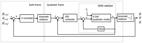This means that the PID speed controller or SDRE speed compensator is redundant and the system can work as a two-unit and two-closed-loop control system. In this case, a thrust force is set as constant and allows one to obtain the desired altitude. The other variables contained in Figure 2 denote: —state vector of the 6 DoF model, —attitude control vector and error vector of the attitude angles .