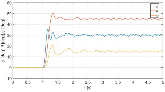 Angular response of the UAV—PID-SDRE control mode, = 1 s.
