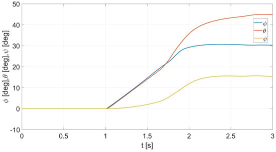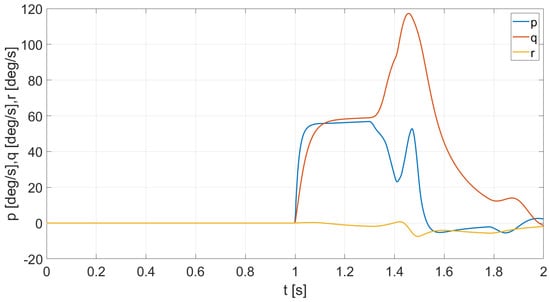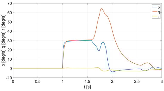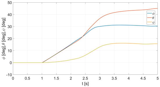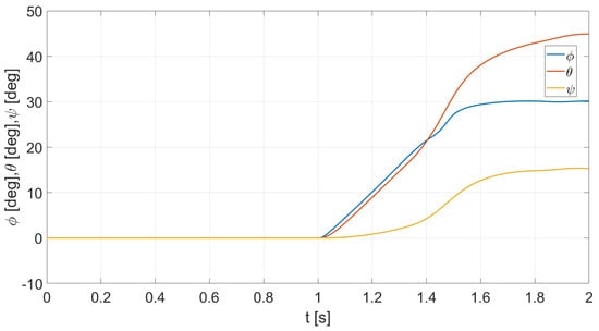 The dynamics of the state of the UAV, in other words, the speed response, including its orientation to the desired angle position, is shown in Figure 3 and Figure 4. The UAV attitude control has been activated at time s; then, the UAV angulary has been moved from the “zero” attitude to the reference angular position. First, simulations are performed for the UAV controlled by the P and PID stabilizer only, neglecting the SDRE stabilizer.
