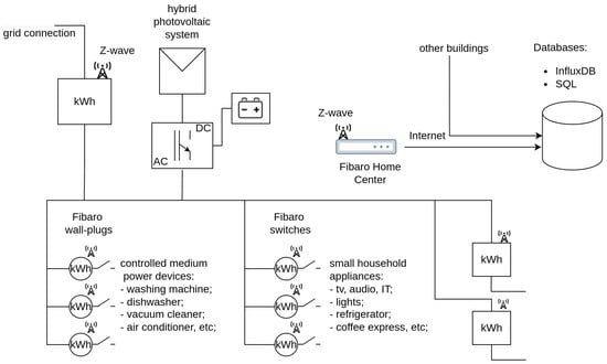 The research presented in this article was carried out as part of a larger scientific project. The project’s main task was to develop a model of the building in the digital twin convention [10]. As part of the conducted project, we installed an electric energy consumption monitoring system for the entire building and for almost all electrical devices in the selected buildings. The schema of the digital-twin model is presented in Figure 1. The energy usage data from different devices were monitored and stored in the databases.