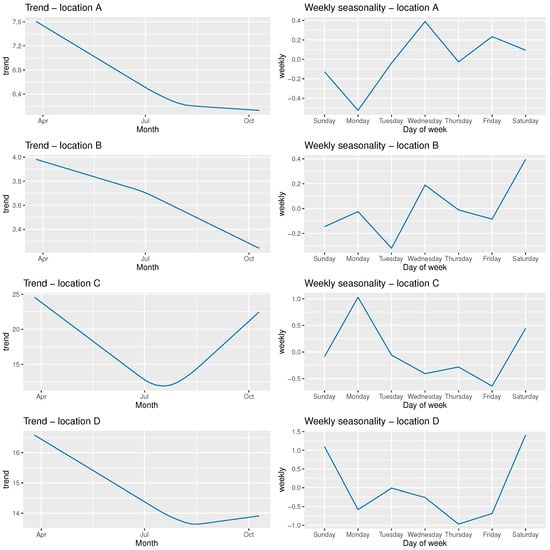 Decomposition of energy consumption time-series for each location. Trend and weekly seasonality are presented.
