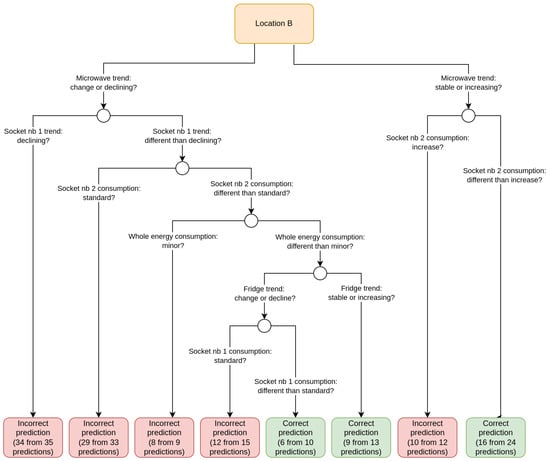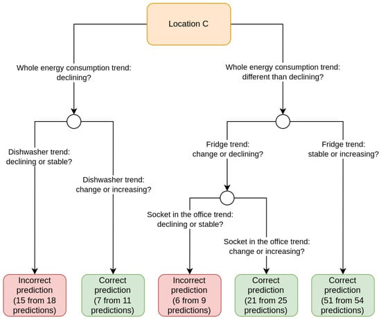 The balanced accuracy of both trees shows that it is possible to find some patterns that describe at which points the Prophet model was wrong and at which points it gave good enough predictions. Some patterns can be difficult to interpret clearly, e.g., it can be difficult for us to understand why the Prophet model for location C gave more bad predictions when the dishwasher trend was stable than when there was a change in the trend. Note, however, that the change in energy consumption and trend characteristics (new attributes) were based on a comparison with the consumption period of the last 14 days. The tree model was learning on the whole data, and it is worth remembering that the stable value over this 14-day period was not necessarily stable in our understanding in the context of the whole dataset.