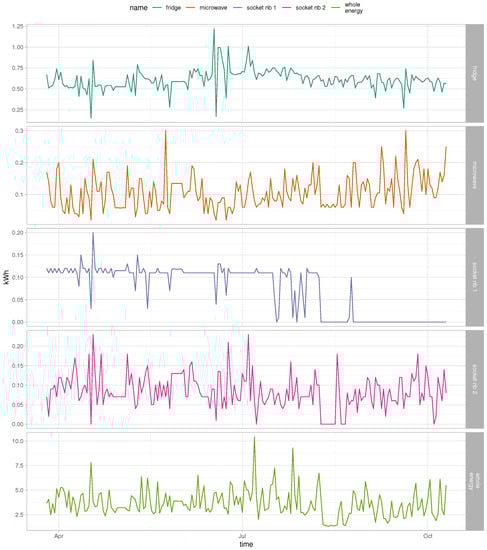 Time series for the whole energy consumption in location B and time series for the devices and attributes used in the decision tree (Figure 3)—microwave, fridge, socket number 1, socket number 2.