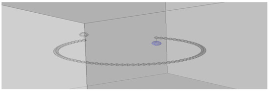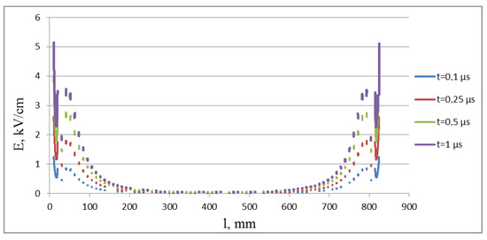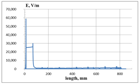 Comparing these results with the results obtained for the simplified LFA (Figure 8), it can be concluded that the intensity on the considered MCA construction elements is much greater than on the LFA electrodes. The maximum values that we have obtained for a simplified loop model of a multi-electrode spark gap are at the level of E = 55 kV/m, which is less than for the MCA. This is due to the structural peculiarities of the chamber system, which differ from LFA with a small number of electrodes placed on the LFA polyethylene surface.