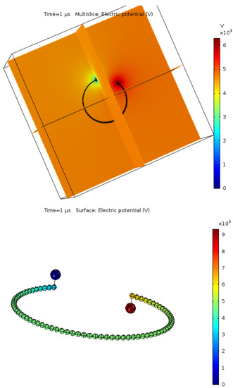 Due to the simplification of the model, the intensity of the electric field in the case of the MCA device is presented at the final stage of the discharge (Figure 6).