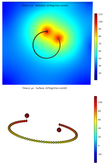 Results of the analysis of the electric field intensity on the electrodes, which are placed on the considered devices, in the case of MCA gave results in the range of 50–100 kV/m (Figure 6). In the case of LFA, it is a comparable level (Figure 8 and Figure 9).