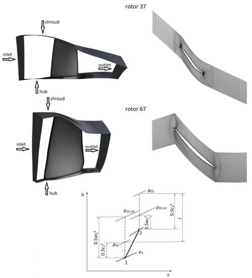The current paper focuses on numerical investigations of homogeneous and heterogeneous condensation influences on the first-stage performance of the gas turbine compressor rotor and the turbofan engine fan. We base our methods and the computational domains for NASA rotors 37 and 67 on previous work available in literature [40,41]. The inflow and outflow for NASA rotor 37 are 5 cm and 8 cm, respectively, whereas the inflow and outflow for NASA rotor 67 are 3 cm and 4 cm, respectively. Note that the tip clearance was neglected as the focus of the study is the condensation phenomena. We generated three numerical meshes for each rotor in accordance with literature guidelines and conduced mesh-dependence study [42]. The meshes named Mesh 1, Mesh 2 and Mesh 3 have, respectively, 0.25, 0.60 and 1.30 million elements for rotor 37 and 0.50, 1.00 and 1.70 million of elements for rotor 67. Despite the fact that Mesh 2 already provides a reasonable solution, and a further increase of mesh density does not improve the convergence of the numerical results with available experiment data, Mesh 3 for both rotor 37 and rotor 67 were selected for target studies due to the better discretization near to the wall. It is of major importance to keep the good discretization of the boundary layer regions, very crucial by modeling the interaction of condensation shock or shock wave with solid wall. It has to be mentioned, owing to the use of the k-ω SST turbulence model, the boundary layer was introduced to ensure y+ 1. Figure 1 presents the computational domain, mesh and the compression process line in an adiabatic compressor. Figure 2 compares for meshes of different density the ratio of the pitch-wise averaged absolute total pressure at the control plane downstream of the blade, p02 to the absolute total pressure at the inlet, p01, obtained numerically and experimentally [43]. We may conclude that even for the coarse numerical mesh, Mesh 1, the comparison of the CFD results with the experiment is satisfactory. However, the condensing flow modeling requires fine mesh to capture the condensation wave properly. The outlet absolute total pressure of rotor 37 was measured at the section located 10.67 cm downstream of the blade hub leading edge. The inlet control plane was located 4.19 cm upstream of the blade hub leading edge. The outlet total pressure for rotor 67 was measured at the section placed 11.01 cm downstream of the blade hub leading edge, while the inlet control plane was located 2.47 cm upstream of the blade hub leading edge. These comparisons demonstrate the effectiveness of the proposed CFD method in modelling the flow in a transonic compressor rotor.