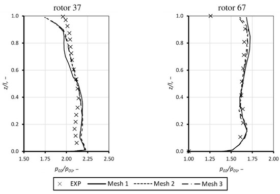 Comparison of the spanwise distributions of the total pressure ratio for different meshes for rotors 37 and 67.