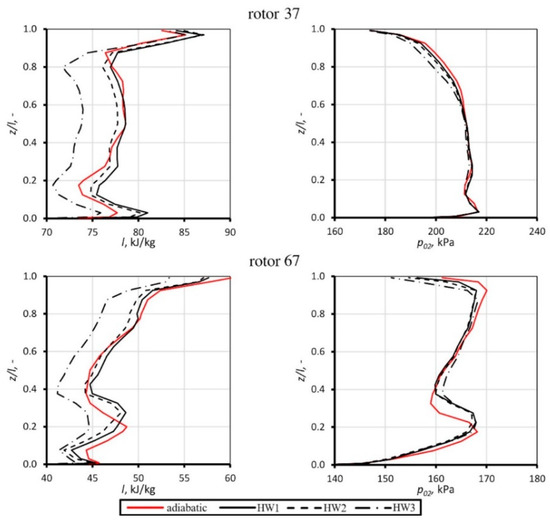 Mass flow rate averaged values of specific work and outlet to inlet relative total pressure ratio for rotors 37 and 67 for HS1, HS2, HS3 and HW1, HW2, HW3.