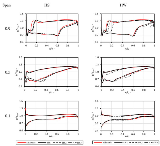 The influence of condensation and evaporation on normalized pressure distribution along the rotor 37 blade at span 0.1, 0.5 and 0.9 for adiabatic, HS and HW.