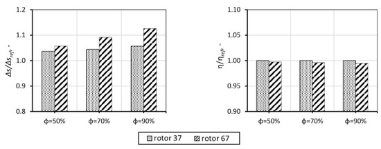 Figure 12 shows the influence of the air humidity on the specific entropy increment in the blade-to-blade channel and its efficiency. With increasing relative humidity, the entropy increment in the blade-to-blade channel is augmented, it is due to the condensation losses, influencing flow parameters, and increasing importance of vapor entropy in mixture entropy. The influence of homogeneous condensation on the efficiency of rotor 37 is negligible, while the efficiency decrement, due to the presence of humidity in the working fluid, in rotor 67 is significant. The influence of homogeneous condensation on rotor 67 efficiency is higher in comparison to the influence of homogeneous condensation on rotor 37 efficiency, as the conditions for condensation in rotor 67 are more favorable. Moreover, the compression work realized by the rotor 67 is lower compared to the compression work realized by rotor 37, therefore the effect of release or absorption of comparable amount of latent heat, due to the condensation and evaporation, has a greater impact on the flow parameters, so on the efficiency of the machinery.