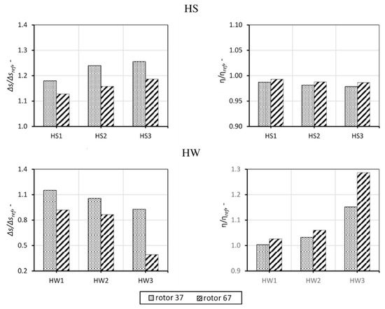 Ratio of outlet to inlet specific entropy increase (left) and ratio of efficiency (right) for HS1, HS2, HS3 and HW1, HW2, HW3 in reference to the adiabatic case.