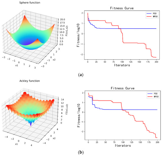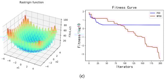 Figure 1 presents the qualitative metrics for the F1–F3 functions, including 2D views of the functions and fitness curves. For the fitness curves in Figure 1, the blue line represents the PSO and the red line represents the MPSO. It can be seen that the convergence speed and accuracy of MPSO are better than that of PSO in test functions.