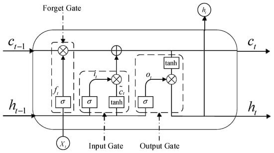 , and denote the forget gate, input gate, and output gate, respectively; W denotes the weight, the symbol denotes the dimension of the input and the dimension of the hidden layer of the previous layer are summed in series, and b denotes the bias term; is the nonlinear activation function sigmod, and and bc are the parameters that the model needs to learn.