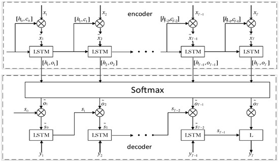 The decoder also selects the LSTM network. First, the decoder step input and the hidden layer state and cell state obtained from Equation (13) are connected as the innovative LSTM structure hidden layer state :