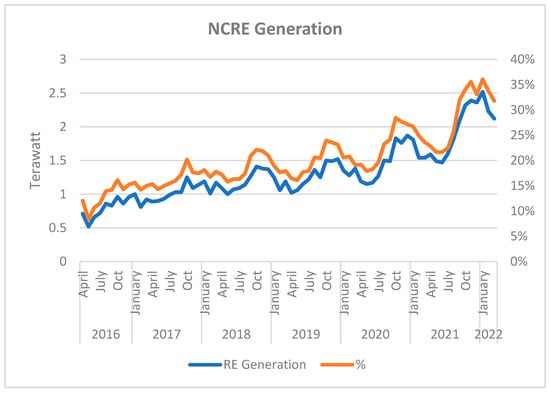 NCRE Generation. Source: Own elaboration based on data from the Coordinator, https://www.coordinador.cl/wp-content/uploads/2022/04/Informe-diario-20-04-2022.pdf (accessed on 5 April 2022).