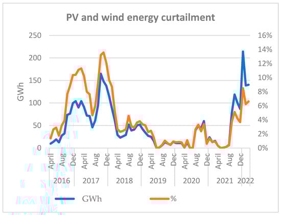 PV and wind energy curtailment. Source: Own elaboration based on data from the Coordinator, https://www.coordinador.cl/wp-content/uploads/2022/04/Informe-diario-20-04-2022.pdf (accessed on 5 April 2022).