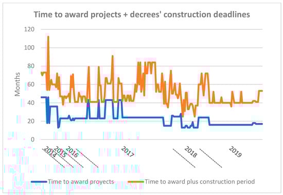 Time to award projects + decree’s construction deadlines. Projects’ location on the horizontal axis follows their order of appearance in the respective decrees. Source: Own elaboration based on Coordinator’s data and Expansion Plan Decrees. The data for Figure 3 can be downloaded at Supplementary Materials.