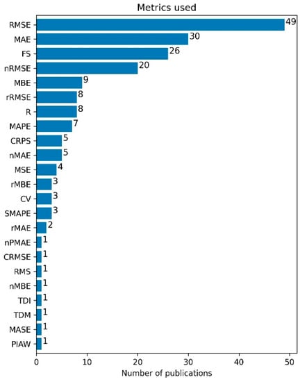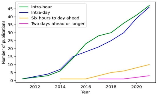 Regarding forecasting horizon, while various classifications can be found in the literature [10,36,47,52,53,67,68], this work considers the one proposed by Antonanzas et al. [49] (found in Table 1) as it is easy to interpret (i.e., avoids abstract expressions, such as “short”, “medium”, “long-term”, to which different authors often associate different horizon ranges) and ensures that shorter-term forecasting is differentiated from larger intra-day horizons.
