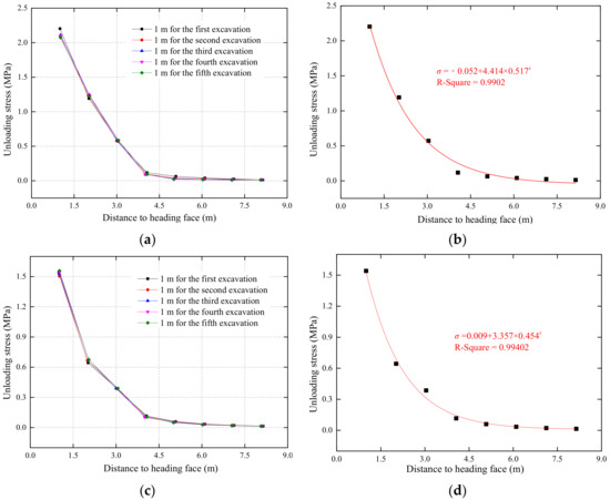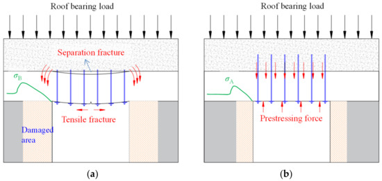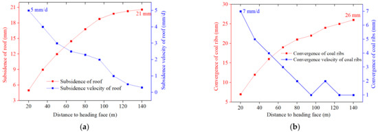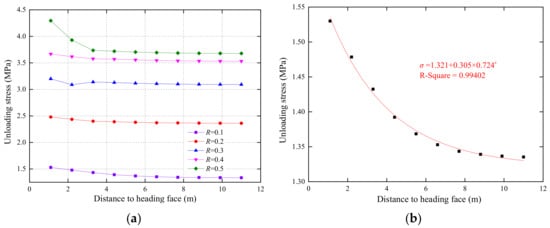 - For low-stress roadways, when lagging 11 m behind the heading face, the low-value stress range of roof strata is 1–2 m, and the low-value stress range of the coal rib is 1 m. After the disturbance of low-stress roadway driving is stable, the stress yield ranges of the roof and coal rib are 1–2 m and 1 m, respectively.