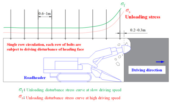 - Study of the fluctuation patterns of the head-on cutting disturbance stress and speed effect of cutting disturbance. The head-on cutting of roadways will result in unloading disturbance on the adjacent anchorage system. Therefore, it is of great significance to study the fluctuation patterns of the head-on cutting disturbance stress of roadways and the attenuation law of the unloading disturbance stress under different driving speeds, providing guidance for weakening the cutting disturbance by improving the driving speed.