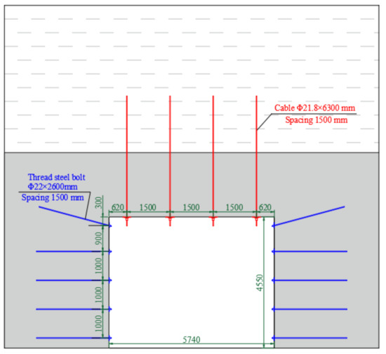 - Roof support: As shown in Figure 13, the roof adopts Φ21.8 × 4500 mm anchor cable supports. Each row has four cables with a spacing of 1500 mm and a row spacing of 1500 mm. All the anchor cables are installed perpendicular to the roof. Each cable is anchored with one MSCK 2360 mm and one MSK2360 mm resin cartridge, and the pre-tightening force of the cable is 200 kN. The yield load of the anchor cable is 706 kN