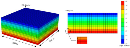 Figure 1 illustrates the 3D reservoir model used to model CO2 injections. The base case model consisted of 12,500 cells divided into a 25 × 25 × 20 grid. The total bulk reservoir volume was 2.5 × 107 m3, while the total pore volume was calculated to be 4.501 × 106 m3. Water–gas contact for the simulated reservoir model was set at 1150 m. The injector was placed at the corner of the model (grid block 1,1,1) with the maximum surface gas rate of 10,000 m3/day and the maximum bottom hole pressure of 44,500 kPa. We used a small reservoir for this study to generate accurate results with a reasonable computational time and it can be easily upscaled for a larger reservoir [42]. The well was perforated from the 18th to the 20th layer with a length of 15m. The allowable injection pressure is generally up to 80% of the rock fracture pressure, as indicated in other works [40,41,42,43,44]. The critical fracture stress in this study was taken according to Lucier et al. [40] for CO2 injection and storage in the Rose Run Sandstone in eastern Ohio, USA. The input parameters for the saline aquifer model are shown in Table 1.