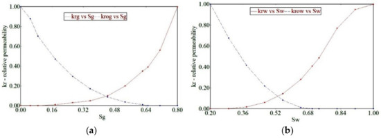 During the CCS operation in deep saline aquifers, the CO2 is injected into the pore spaces of rocks previously occupied by saline groundwater. Hence, relative permeability is an important parameter for determining the effective permeability of both CO2 and brine. Several theoretical and experimental models account for the relative permeability of brine–CO2 systems. Figure 2 shows the relative permeability curve adapted for the reservoir model [45]. We also used a critical gas saturation of 0.4 during the drainage of the reservoir rock due to the hysteresis.