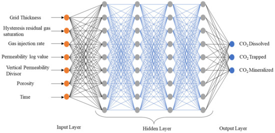 Machine learning models have also been used to study CCS operations. For example, Le and Chon [36] used the artificial neural network (ANN) to evaluate the performance of CO2-EOR by measuring the oil recovery factor, gas–oil ratio, cumulative CO2 production, and net CO2 storage. They concluded that the ANN generated an accurate proxy model for various reservoir conditions to optimize oil recovery and the long-term storage of CO2. Other studies have used different ANN models to optimize the CO2-EOR projects [37] and estimate the oil recovery performance of depleted reservoirs [38]. Ahmadi et al. [34] used an ANN to predict the feasibility of CO2 sequestration in CCS in deep saline aquifers. They used 800 different data points from the literature to predict the viscosity of the injected CO2 by using an ANN. Kim et al. [39] used an ANN for storage efficiency in a saline aquifer. They varied different reservoir properties such as permeability, porosity, thickness, residual oil saturation, and depth to generate 150 other reservoir models used to create the proxy model based on an ANN.