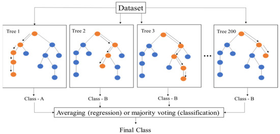 Random forest (RF) is an ensemble-based algorithm based on tree-predictor-based classification [59]. The regression trees are developed using a subset of input variables and training data samples, which offers a stable prediction result and a controlled level of nonlinearity in the training data samples [35,59]. Furthermore, the tree nodes are separated using binary splits, effectively preventing overfitting issues, as illustrated in Figure 4. This study selects 200 decision trees and a minimum number of 2 samples for each leaf node, as shown in Table 2. Each regression decision tree can be trained using sampling bags in the training dataset. In contrast, the prediction errors can be determined using samples without the training dataset, also referred to as out-of-bag (OOB) samples. The mean square error is expressed as follows [38,59]: