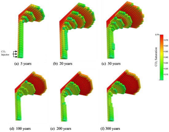 The reservoir was injected with CO2 for 25 years, after which it was monitored for the next 275 years. Figure 5 shows the 3D CO2 saturation profile for the reservoir after five years, twenty years, fifty years, one hundred years, two hundred years, and three hundred years, respectively. To generate the 3D view, we considered only the grid blocks where the impact of gas saturation was noticeable. This study considered three major CO2 trapping mechanisms: residual trapping, dissolution trapping, and mineral trapping. At the beginning of the injection period, most of the CO2 is trapped due to capillary trapping or residual trapping. However, as the density of the supercritical CO2 is considerably lower than the brine density (950–1250 kg/m3), most of the CO2 rises upward within the aquifer until it reaches an impermeable horizontal caprock and is structurally trapped. The supercritical CO2 may further spread laterally over a large area due to its buoyancy, the lateral movement of the aquifer, and the slope of the caprock until it experiences another vertical trap [64]. After a significant amount of time, the structurally trapped CO2, which is in contact with the brine, slowly dissolves by molecular diffusion, resulting in the dissolution trapping. Thus, there is a noticeable decrease in the rate of CO2 residual trapping throughout time, whereas the solubility of CO2 trapping increases gradually. Dissolution trapping is one of the most dominant storage mechanisms with the maximum storage security of CO2 in a reservoir [5]. The brine–CO2 solution is slightly denser than the pure brine by a factor of 0.1–0.2%, depending on conditions in the aquifer [64,65]. This density gradient between the top layer and the layer immediately below it creates a buoyant instability which results in convective mixing. The CO2-rich layer at the top sinks to the bottom of the aquifer and is replaced by fresh brine. This process creates a loop migrating the free CO2 trapped as a separate phase to the bottom of the aquifer as the brine–CO2 solution. Although difficult to quantify, convective mixing is hypothesized to increase CO2 storage in saline aquifers [64,65] significantly. However, vertical and horizontal permeability anisotropy (heterogeneities) present in the porous media further complicates the spatial and temporal aspects of CO2 dissolution in brine [65]. Finally, the geochemical properties of the brine and the reservoir may also significantly enhance the transfer of supercritical CO2 due to mineral trapping [66]. The dissolution of CO2 into the brine is vital to prevent the possibility of CO2 leakage from the faults and cracks that may be present in the geological seal.